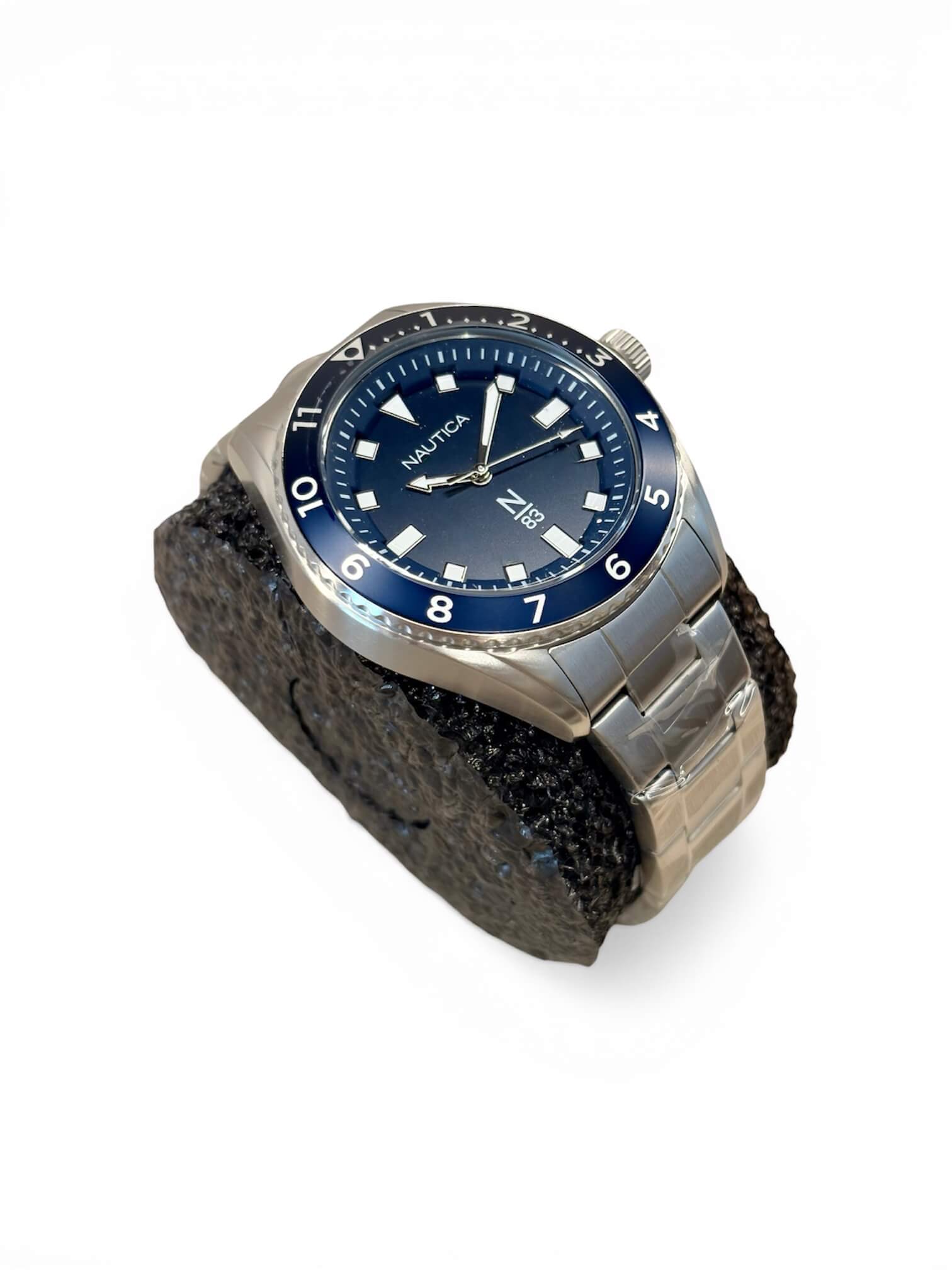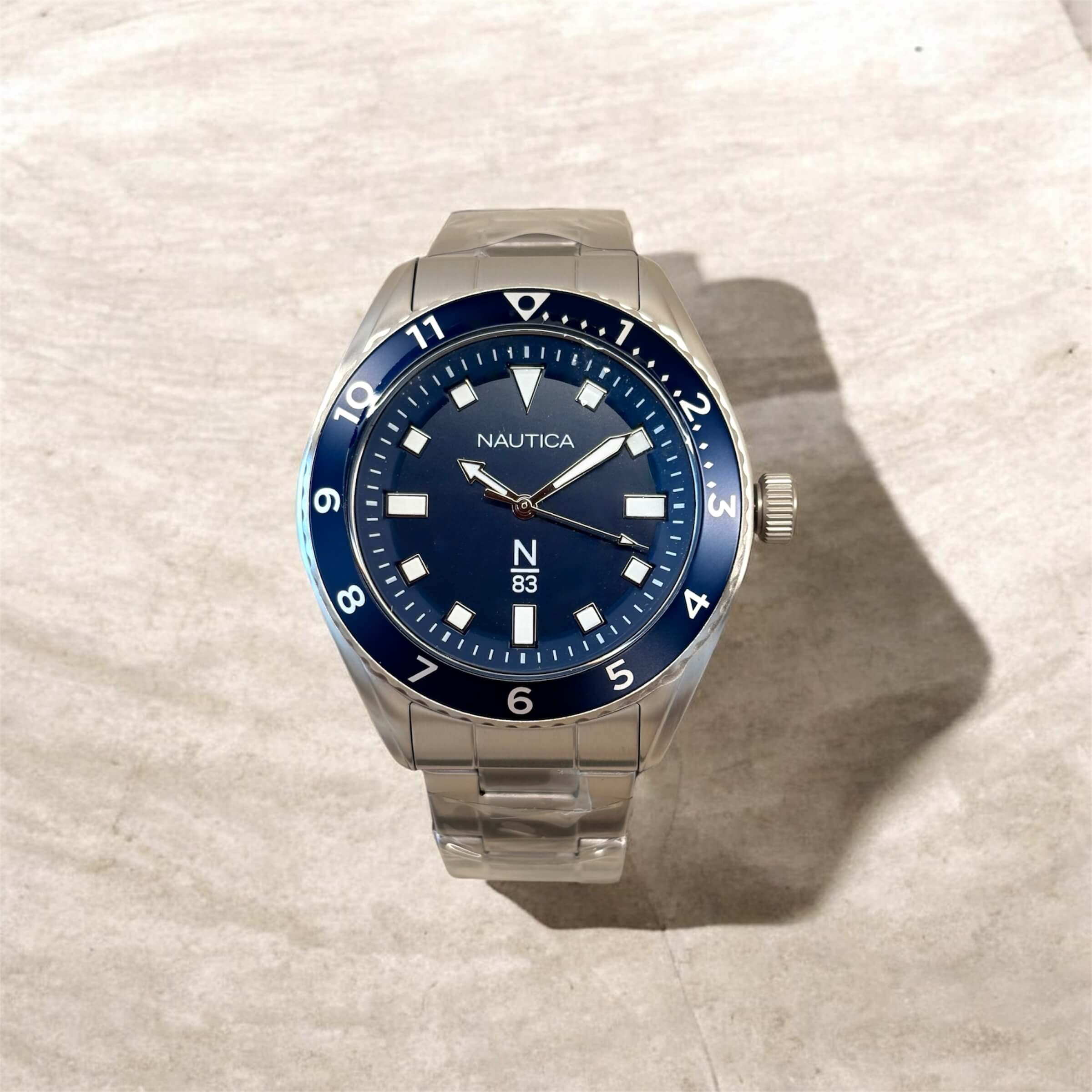 • Aνδρικό ρολόι Nautica με ασημί ατσάλινο μπρασελέ και μπλε καντράν με βιδωτή κορώνα