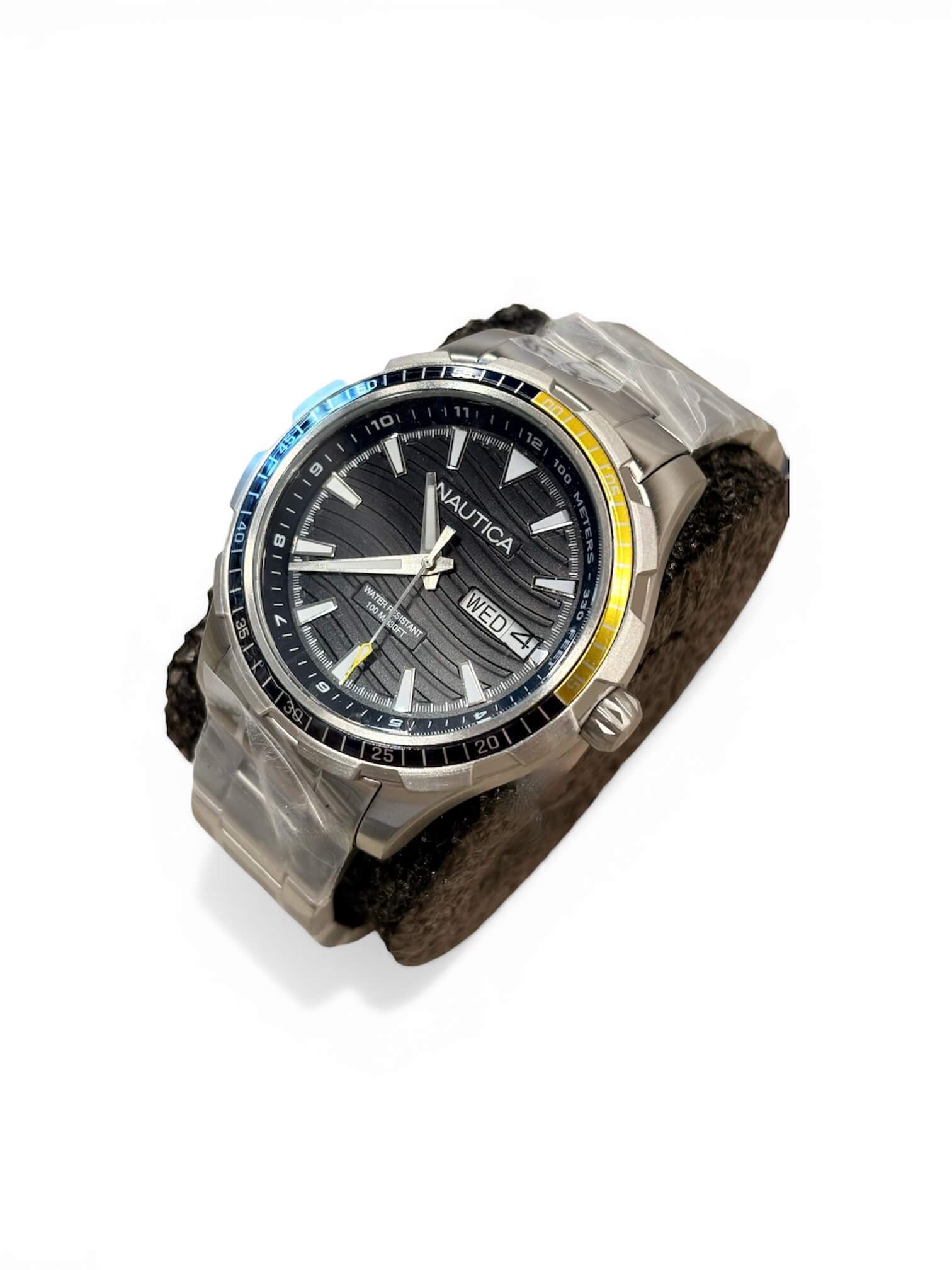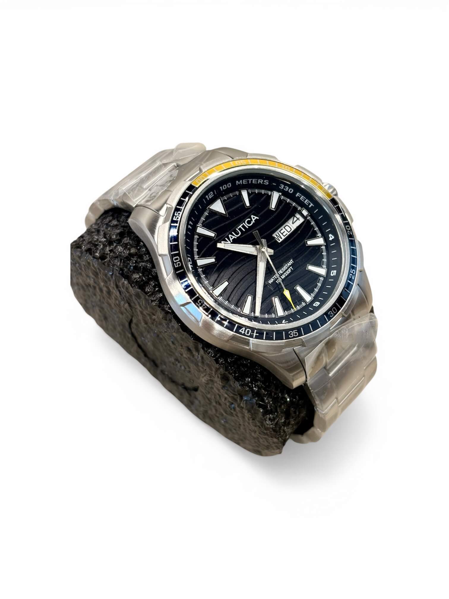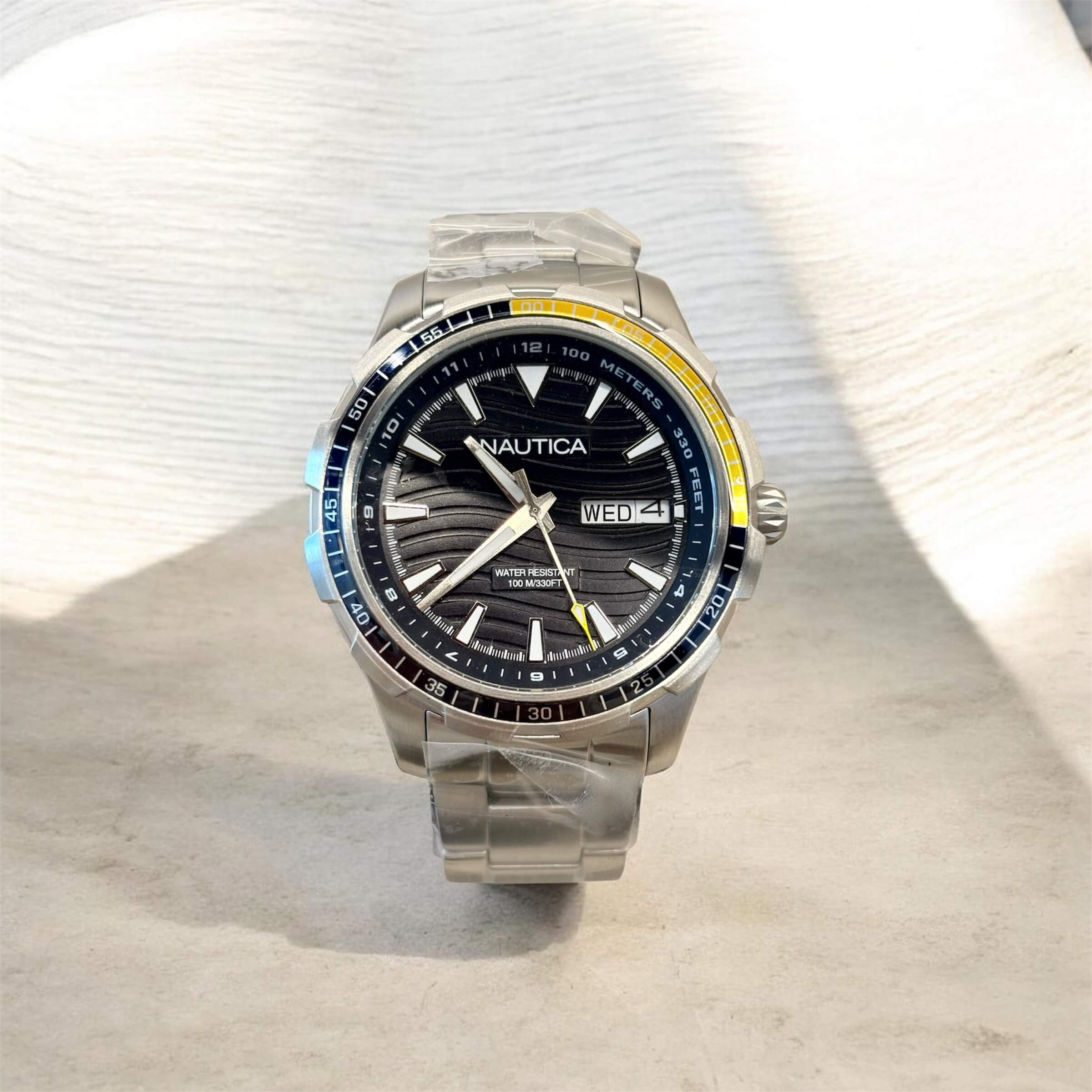Aνδρικό ρολόι Nautica με ασημί ατσάλινο μπρασελέ και μαύρο καντράν με βιδωτή κορώνα
