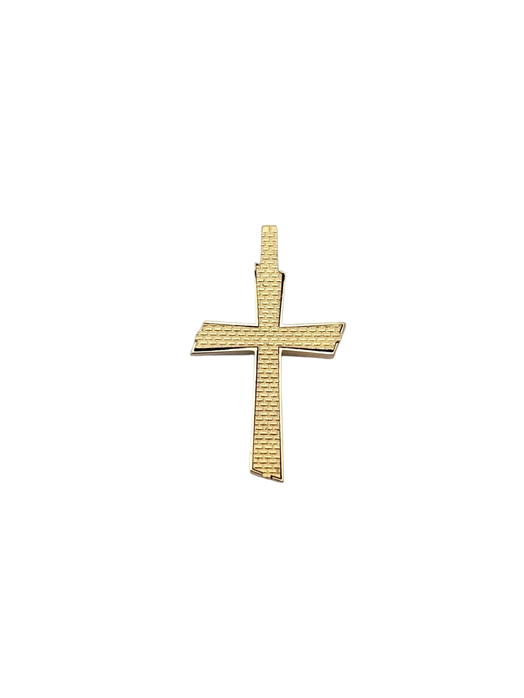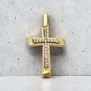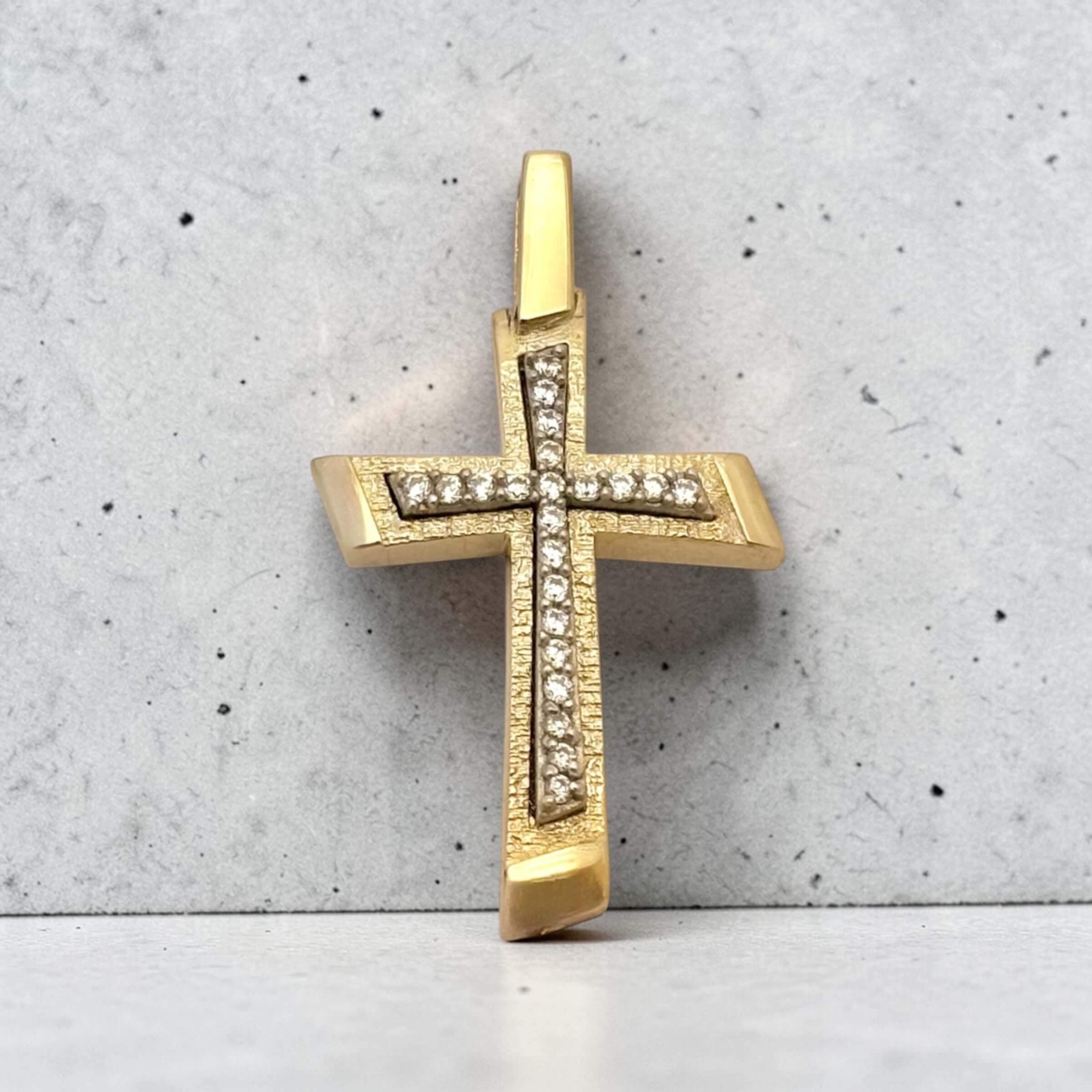 Χρυσός σταυρός βάπτισης για κορίτσι ματ σε συνδυασμό με λουστράτες άκρες και πέτρες ζιργκόν διπλής όψης ,κ9
