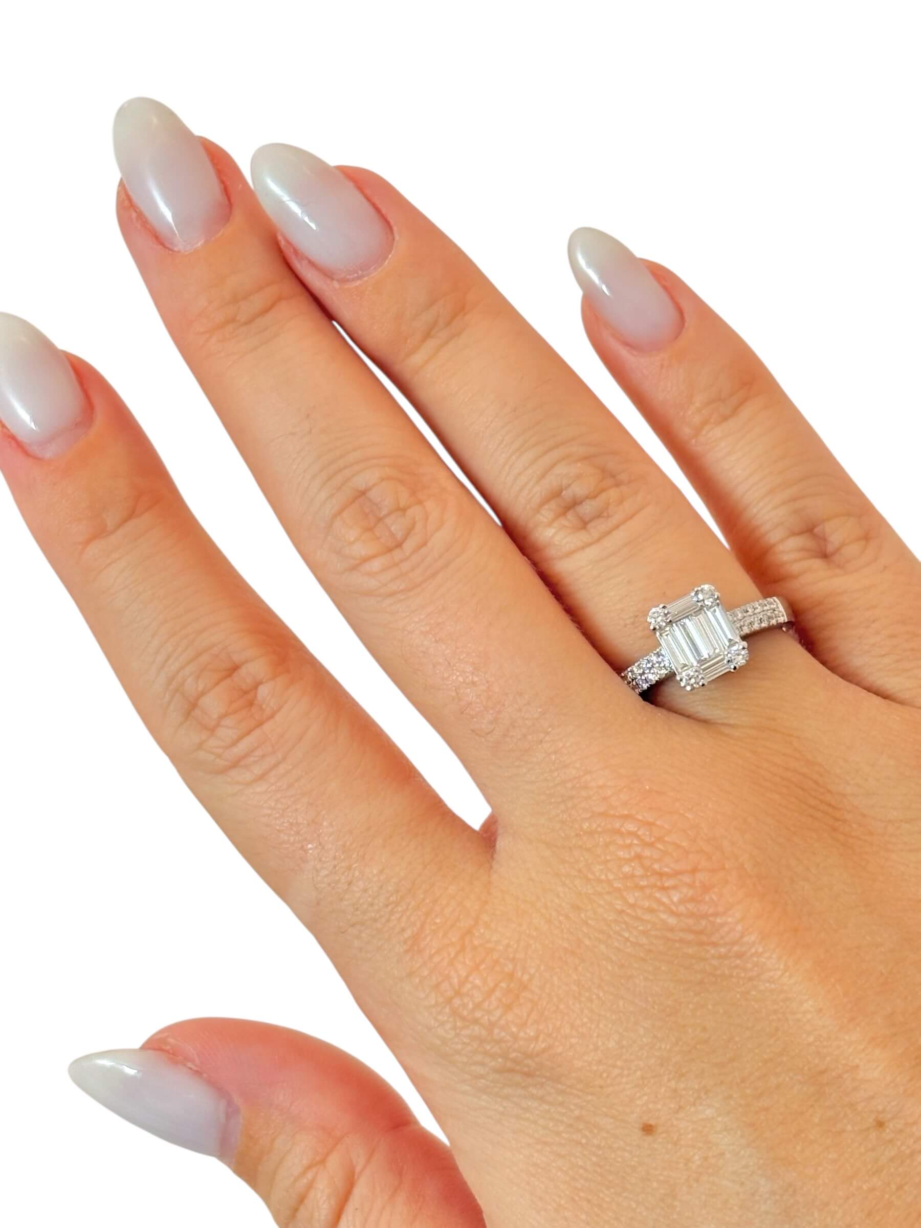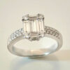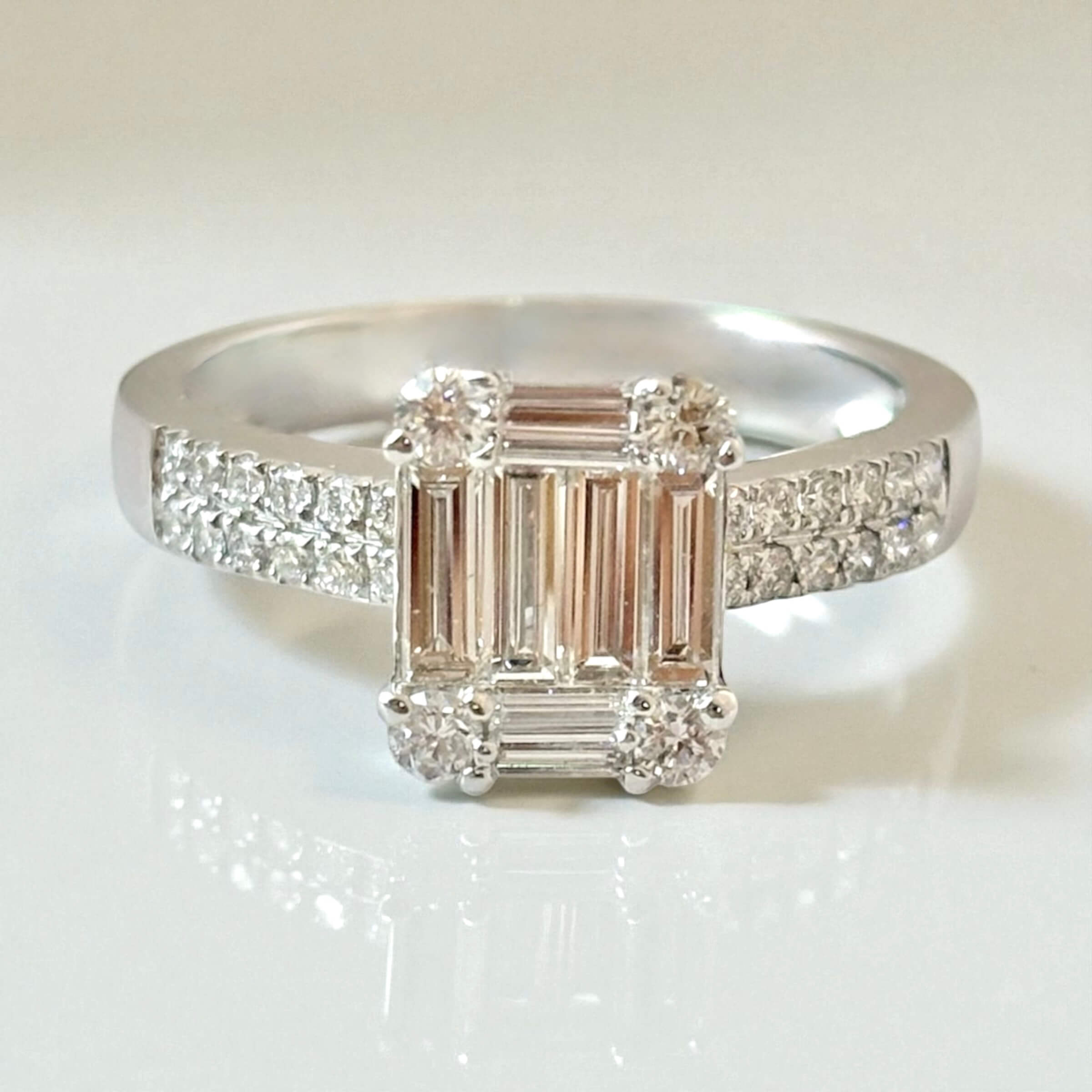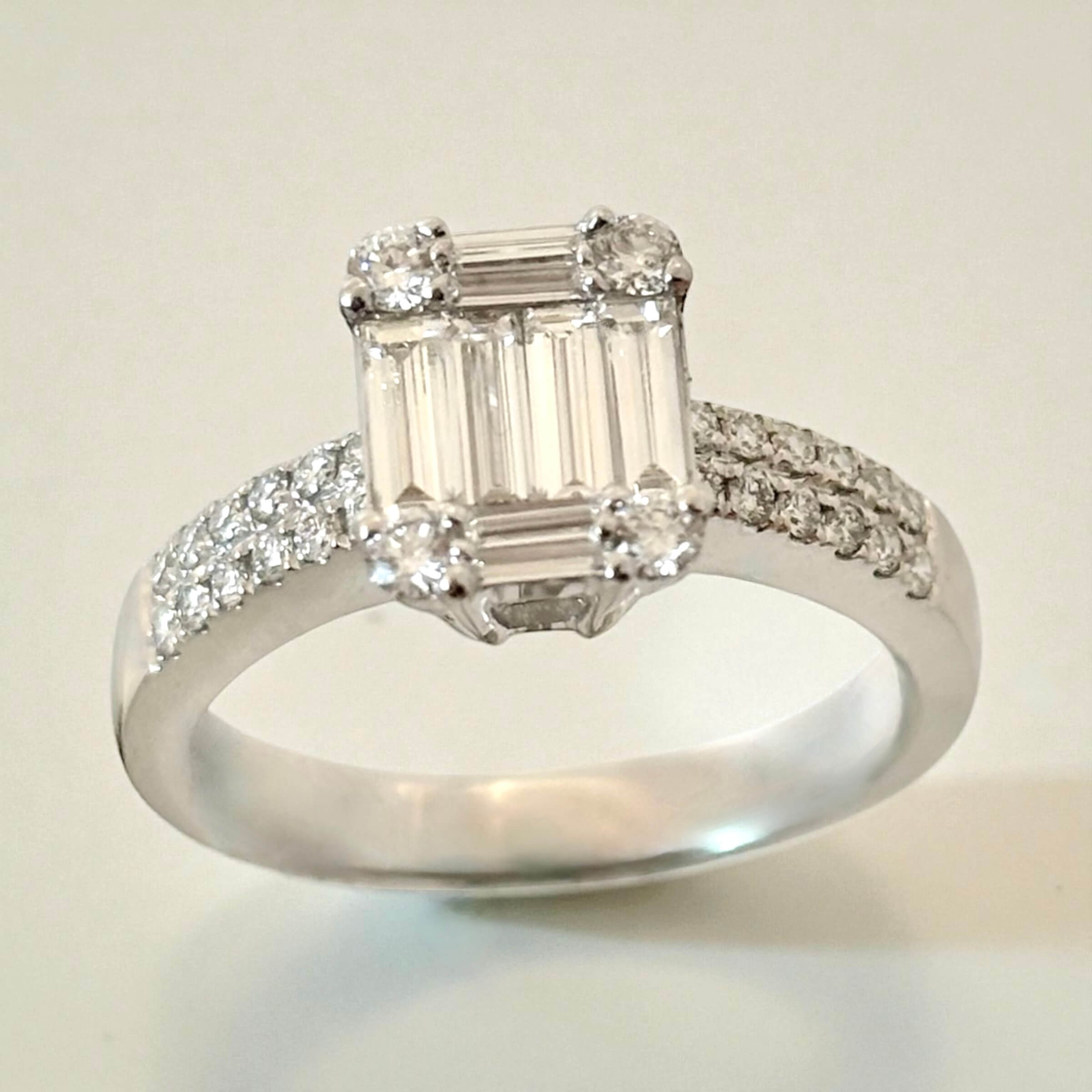 Λευκόχρυσο μονόπετρο δαχτυλίδι με διαμάντια κοπής brilliant και baguette , κ18. Το μέγεθος των brilliant πετρών είναι 0.33ct και το μέγεθος των baguette πετρών είναι 0.51ct