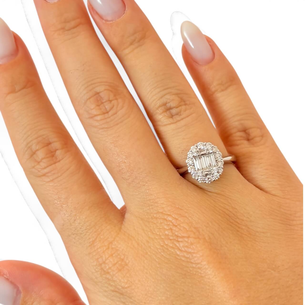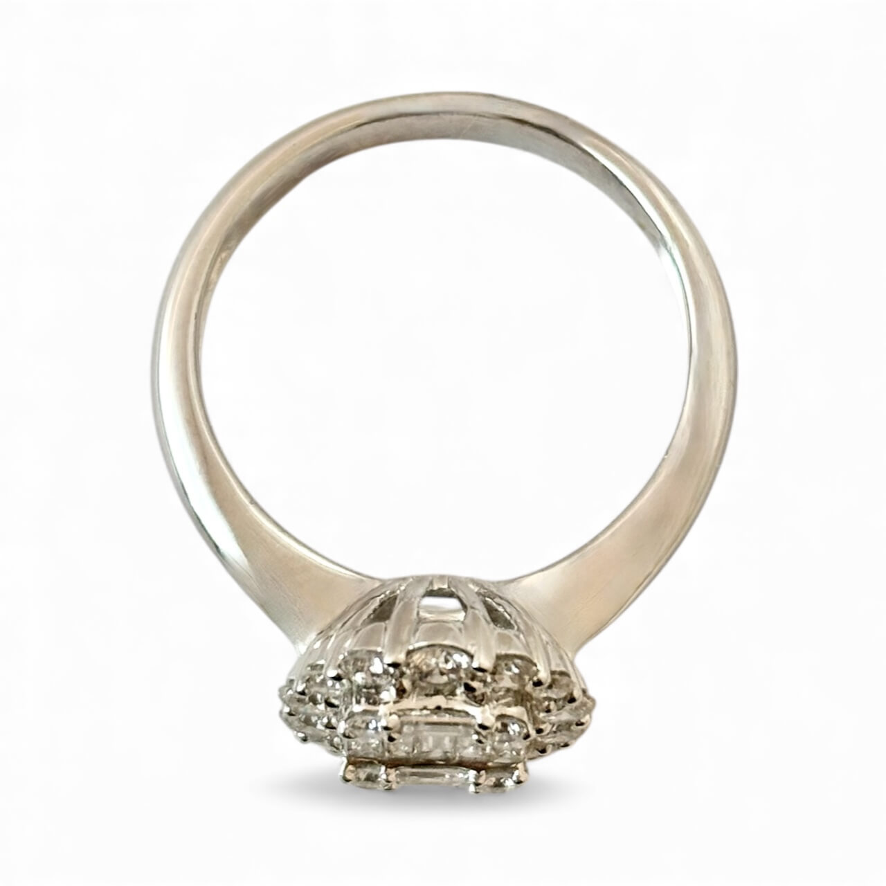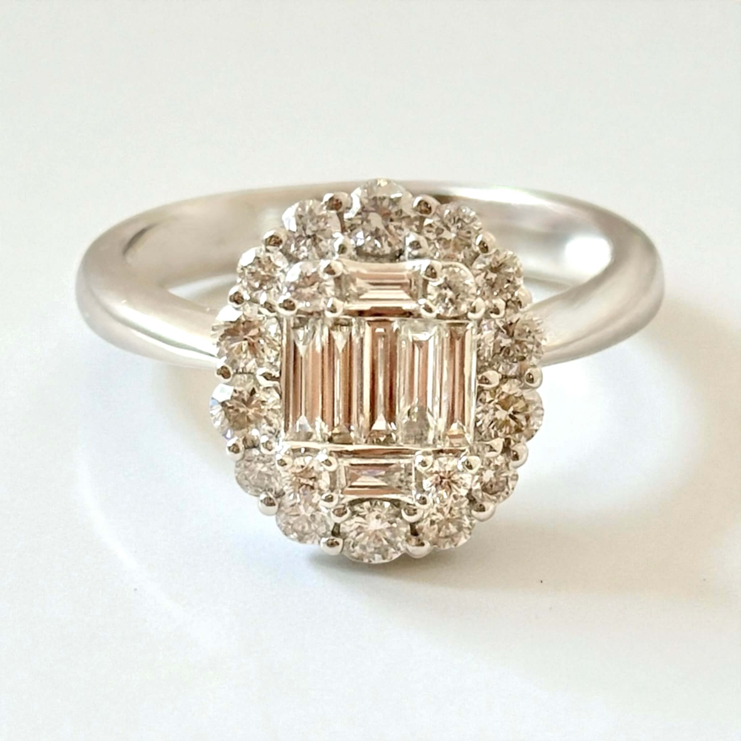 Λευκόχρυσο μονόπετρο δαχτυλίδι με διαμάντια κοπής brilliant και baguette , κ18. Το μέγεθος των brilliant πετρών είναι 0.54ct και το μέγεθος των baguette πετρών είναι 0.26ct.