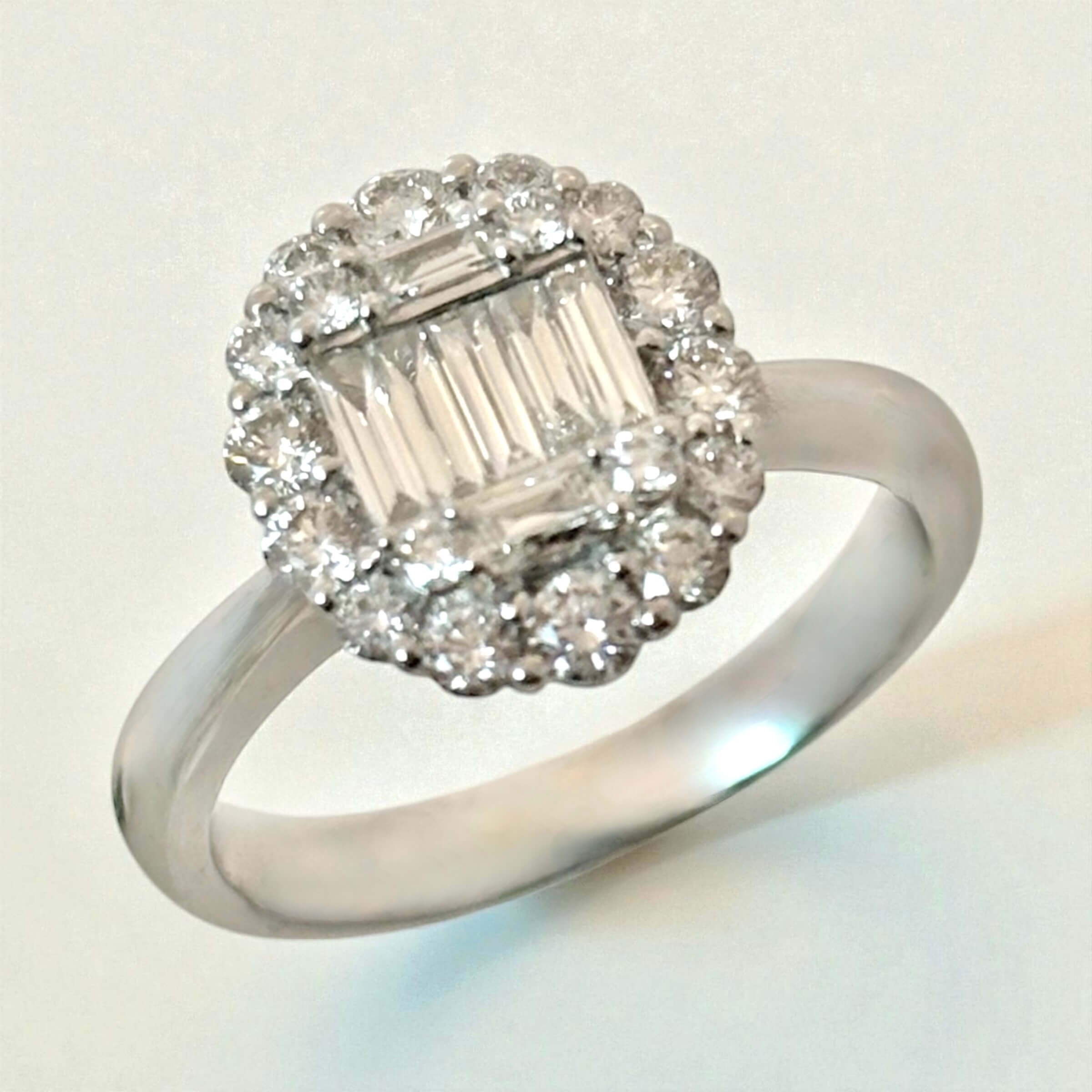 Λευκόχρυσο μονόπετρο δαχτυλίδι με διαμάντια κοπής brilliant και baguette , κ18