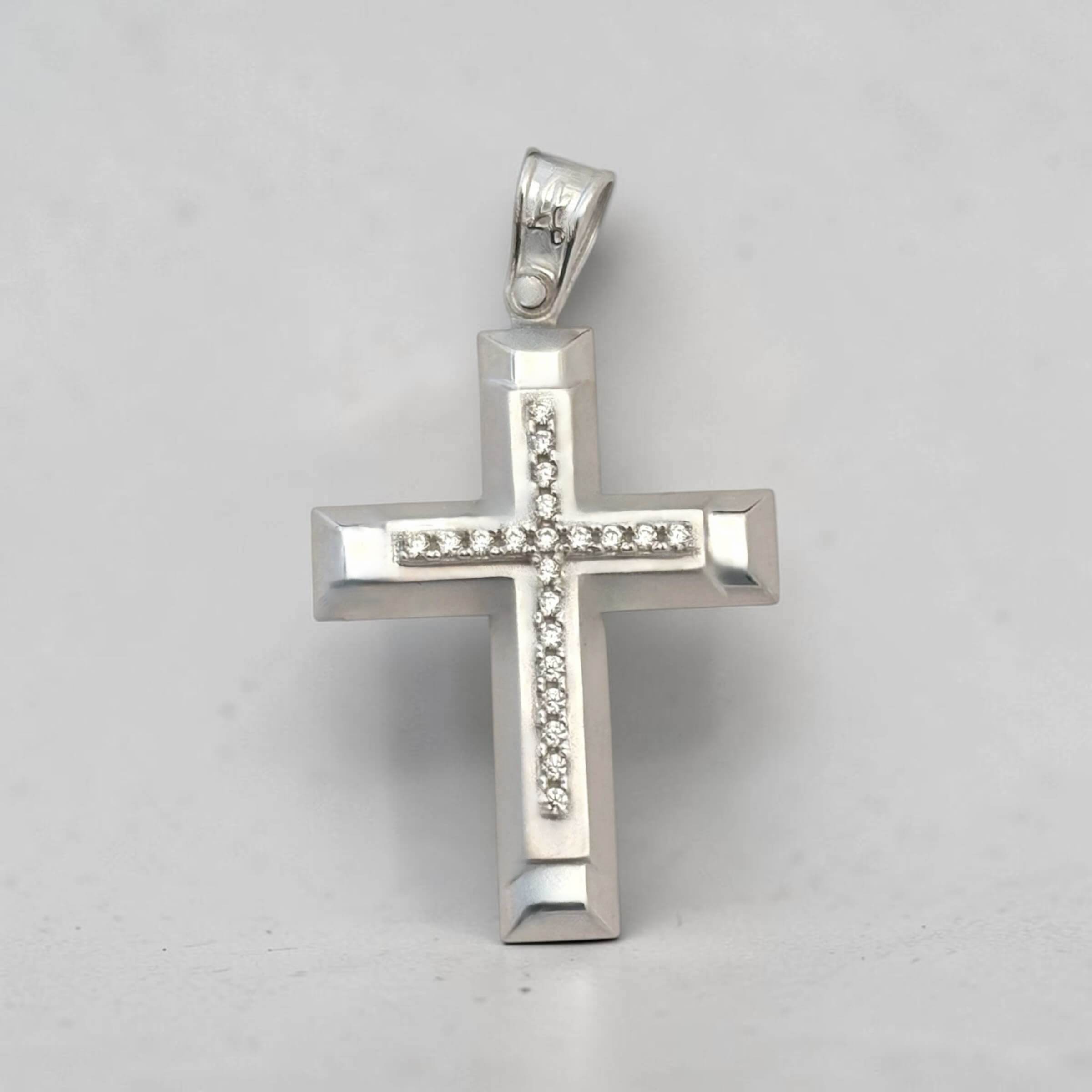 Λευκόχρυσος σταυρός βάπτισης για κορίτσι ματ με λουστράτες λεπτομέρειες και πέτρες ζιργκόν , κ14
