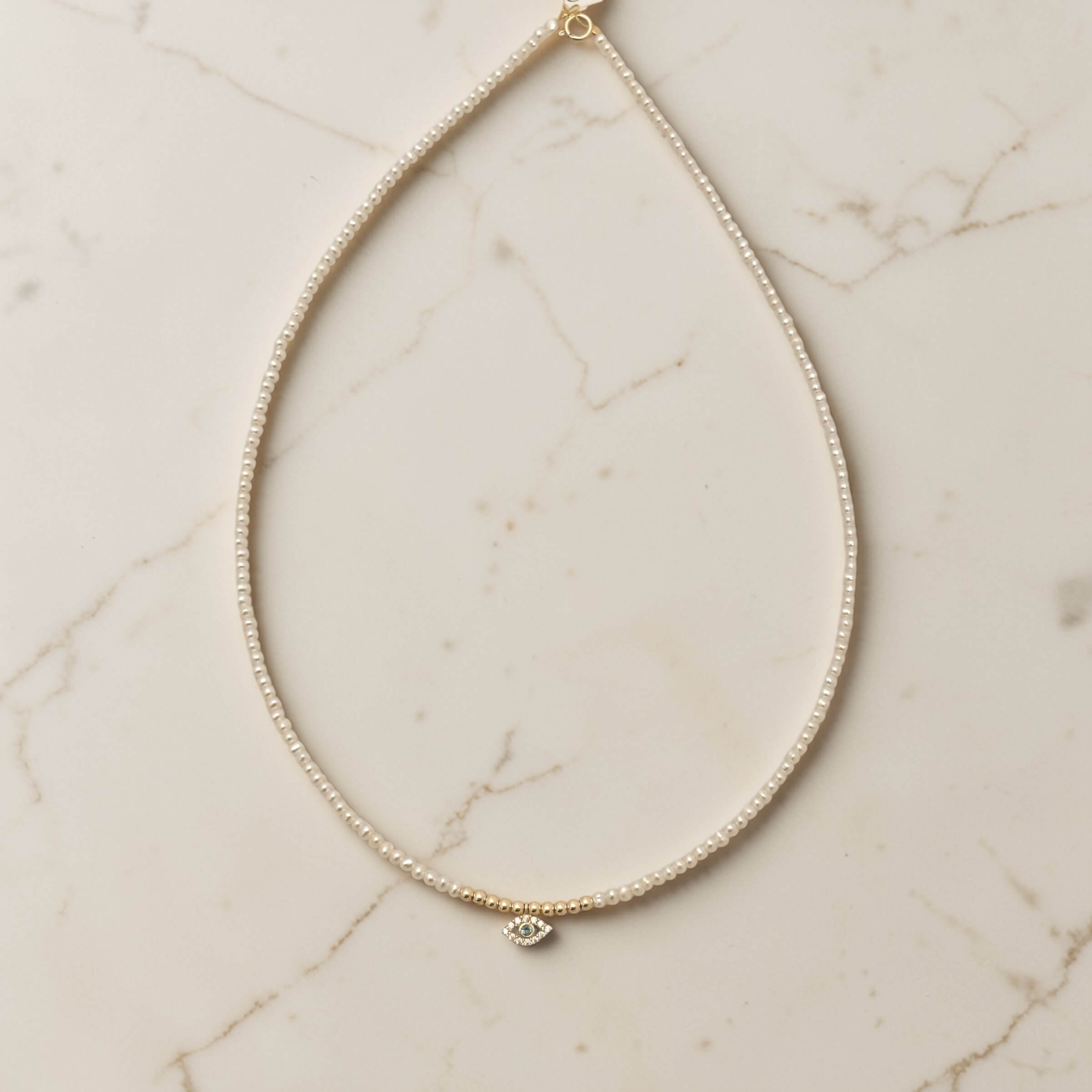 Μενταγιόν με μαργαριτάρια fresh water 2.5mm-3mm και χρυσές μπίλιες και κρεμαστο χρυσό ματάκι , κ14